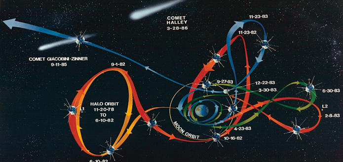 Most of the best information that we have been able to find has been from the people who worked on the project in the 1980’s when the spacecraft was fully operational. After its baseline mission, ISEE-3 was repurposed and rechristened as the International Cometary Explorer (ICE). This image shows the trajectory of ISEE-3/ICE during that period: